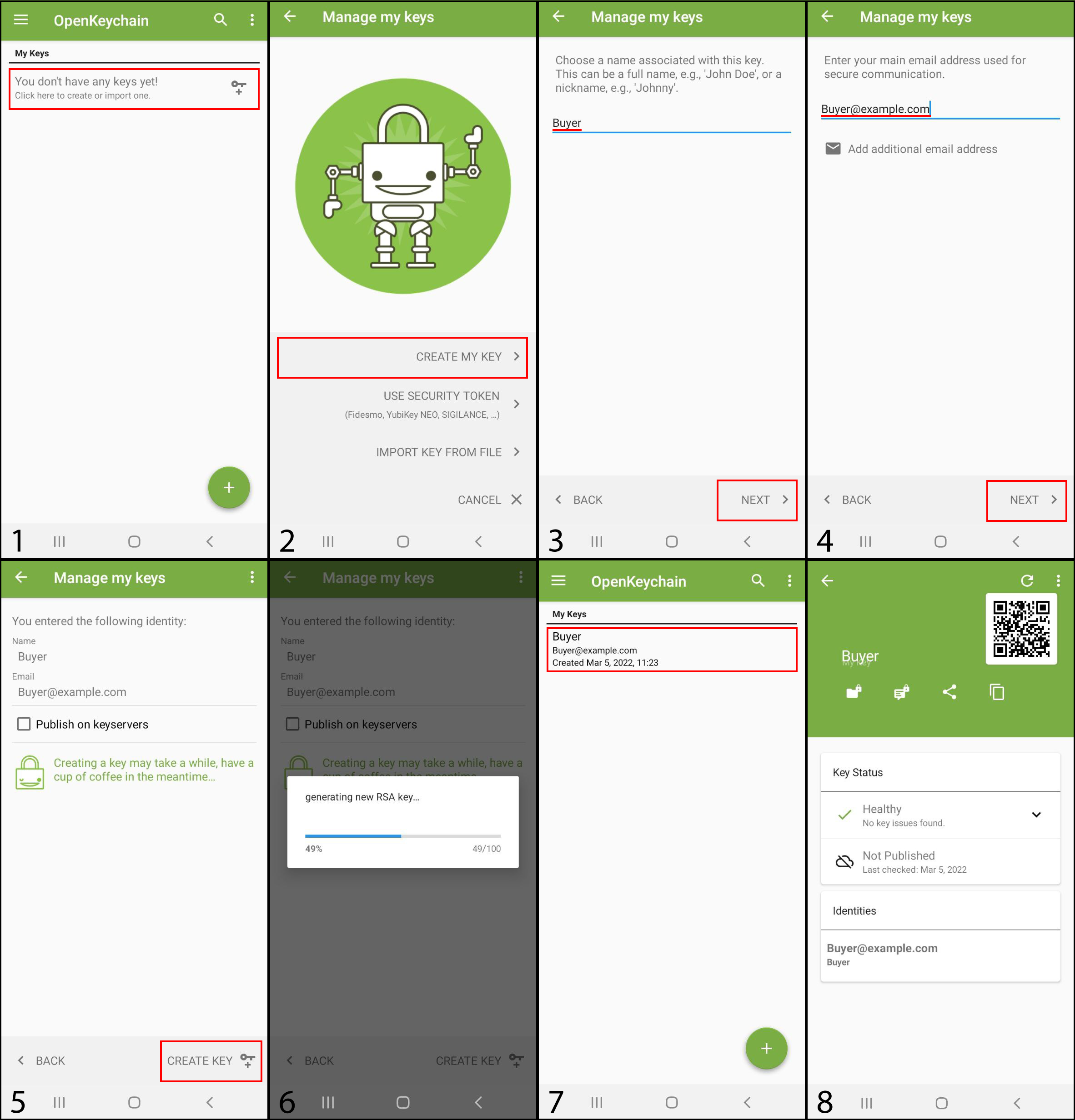 Ahora el comprador tiene dos claves: la clave privada sólo debe ser conocida por su propietario (en este caso concreto el comprador, que también la ha creado); la clave pública puede ser conocida por cualquier otra persona (el vendedor). El vendedor necesita la clave pública del comprador para cifrar los datos confidenciales, por lo que el comprador debe enviar el texto sin formato que representa la clave pública. Los pasos a continuación muestran cómo compartir el texto sin formato que representa la clave pública (imágenes 1-2), y también cómo el vendedor puede agregarla a su aplicación OpenKeychain para usarla más tarde (imágenes 3-8).